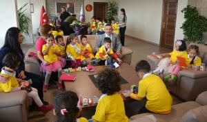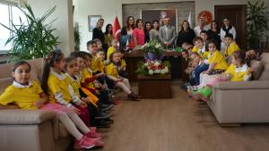 Çanakkale Onsekiz Mart Üniversitesi Çocuklar Evi Kreş ve Anaokulu öğrencileri, Çocuklar Evi Koordinatörü Meral Aydın ve öğretmenleriyle birlikte ÇOMÜ Rektörü Prof. Dr. Yücel Acer’i makamında ziyaret ettiler.
