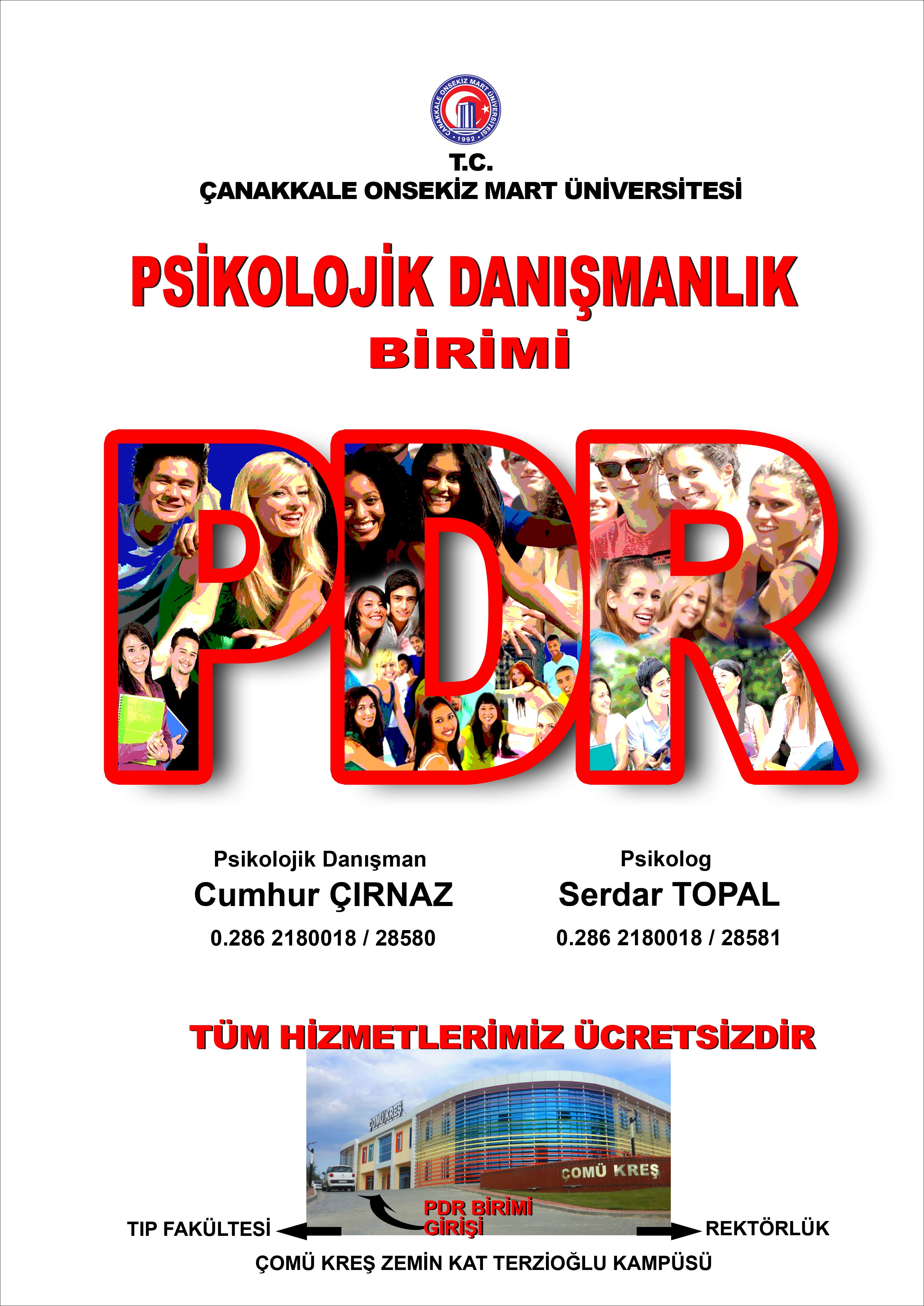 2004 yılı içerisinde Sağlık Merkezi bünyesinde hizmet vermeye başlayan ÇOMÜ Psikolojik Danışmanlık Birimi Çanakkale Onsekiz Mart Üniversitesi öğrencilerinin kendilerini tanımalarına, gizil güçlerinin farkına varmalarına, kullanmalarına ve geliştirmelerine, problemlerini çözmelerine, bireylerin kendilerini gerçekleştirmelerine ve çevrelerine uyum sağlamalarına yardımcı olmak amacıyla bireysel ve grupla psikolojik yardım sağlamak, gelişimsel ve eğitsel programlar düzenlemek, yapılan çalışmaları değerlendirmek amacıyla bir çok çalışma gerçekleştirmektedir. Birim tüm akademik, idari personelimiz ve ailelerinin yanı sıra ÇOMÜ Kreş ve Anaokulu’nda da psikolojik danışmanlık, aile danışmanlığı ve seminer çalışmaları yürütmektedir. Öğrencilerimiz, idari ve akademik personelimiz ve ailelerine yönelik tüm hizmetler ücretsizdir. Ayrıntılı bilgi için pdrbr.comu.edu.tr adresinden bize ulaşabilirsiniz.