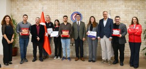 Çanakkale Onsekiz Mart Üniversitesi Rektörü Prof. Dr. R. Cüneyt Erenoğlu, TEKNOFEST 2025’te projeleriyle ödül kazanan öğrencileri Rektörlük makamında ağırlayarak teşekkür belgelerini takdim etti.