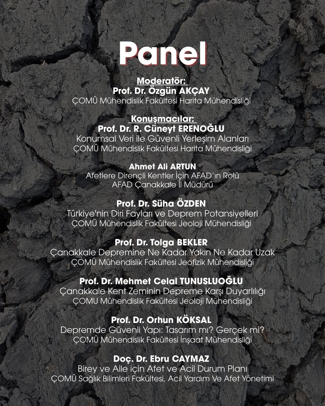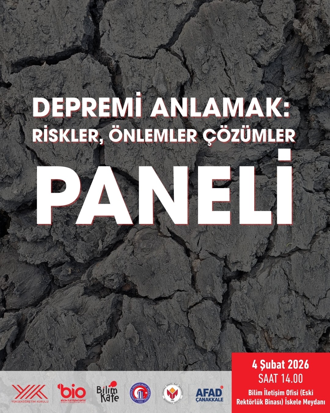 ÇOMÜ Mühendislik Fakültesi, Bilim İletişimi Ofisi ve AFAD Çanakkale iş birliğiyle gerçekleştirilecek panelde; Türkiye’nin diri fayları ve deprem potansiyeli, güvenli yerleşim alanlarının belirlenmesi, yapı ve zemin güvenliği, Çanakkale’nin deprem riski, birey ve aileler için afet ve acil durum planlaması ile afetlere dirençli kentler konuları, alanında uzman akademisyenler ve AFAD temsilcisi tarafından ele alınacaktır.