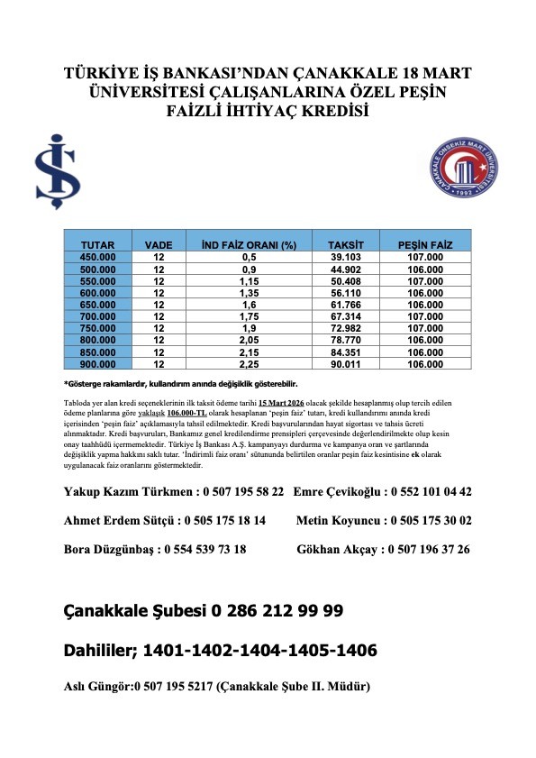 İş Bankası ile imzalanan protokol çerçevesinde çalışanlarımıza sunulan faizsiz (peşin ödenen faizli) ve düşük faizli kredi seçenekleri ekteki broşürde yer almaktadır.