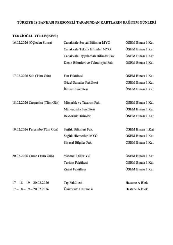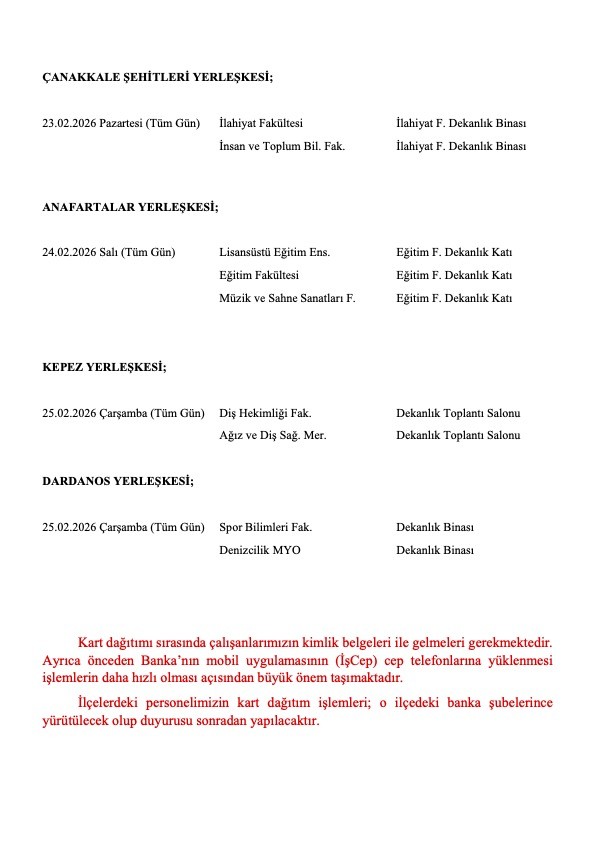Türkiye İş Bankası personeli tarafından gerçekleştirilecek banka kartı dağıtım süreci, üniversitemizin farklı yerleşkelerinde belirlenen takvim doğrultusunda yürütülecektir. Aşağıda yer alan program kapsamında ilgili fakülte, yüksekokul ve birimlerde görev yapan personelimizin belirtilen gün ve saatlerde dağıtım noktalarında hazır bulunmaları; işlemlerin hızlı ve sorunsuz tamamlanabilmesi için kimlik belgelerini yanlarında bulundurmaları ve mobil bankacılık uygulamasını önceden yüklemeleri önemle rica olunur. İlçelerde görev yapan personelimize ilişkin süreç ise ilgili şubeler aracılığıyla ayrıca duyurulacaktır.