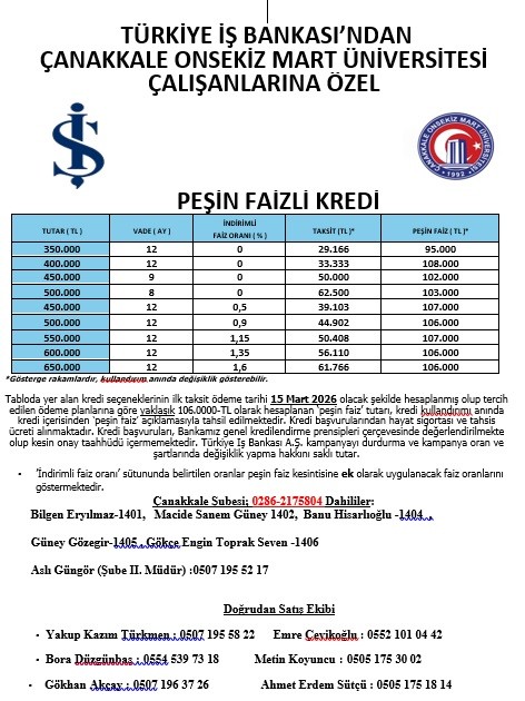 Çanakkale Onsekiz Mart Üniversitesi Rektörlüğümüz ile İş Bankası arasında 06.02.2026 tarihinde imzalanan ve Üniversite personelinin maaş ve diğer ödemelerine 15/03/2026 tarihinden başlamak üzere 36 ay süreyle aracılık edilmesini içeren sözleşmemiz kapsamında tüm Üniversite personeline (intern hariç) kişi başı 106.000-TL nakit promosyon ödenecektir. Promosyon tutarları, ilk maaş ödemesinin akabinde en geç 31.03.2026 tarihine kadar peşin olarak hesaplara yatırılacaktır.
